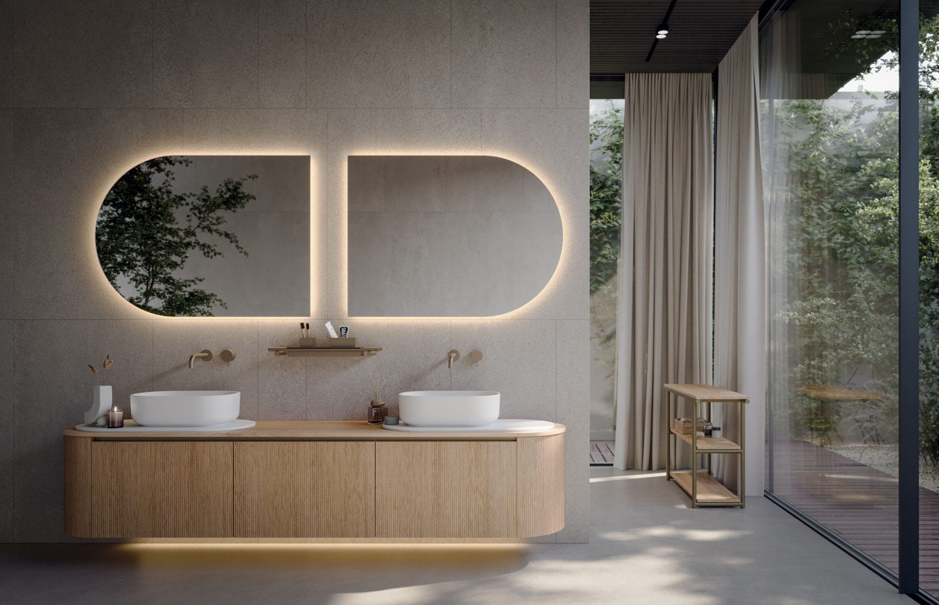 Accanto a questa versione, la collezione propone anche frontali lisci e la variante “Tris” in noce canaletto, caratterizzata da un raffinato incrocio di venature, per soluzioni ancora più esclusive e personalizzate. Un altro elemento distintivo è la maniglia in alluminio a forma di “L”, integrata lungo il bordo dell’anta. Questo dettaglio, da cui la collezione prende il nome, garantisce un’apertura pratica e continua, mantenendo al tempo stesso un design pulito ed essenziale. Dal punto di vista progettuale, Elle si distingue per la sua versatilità. I mobili possono essere configurati sospesi, a terra o su struttura metallica, permettendo di adattare ogni composizione alle esigenze specifiche dello spazio. Questa flessibilità consente di creare soluzioni su misura, ideali sia per bagni moderni sia per ambienti più sofisticati.